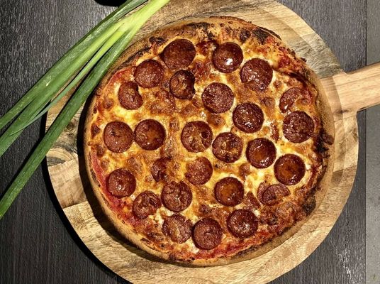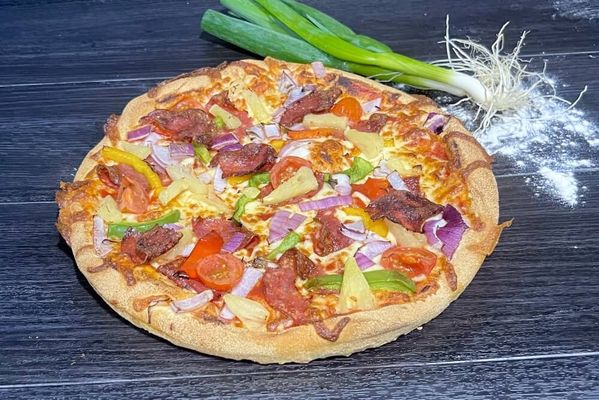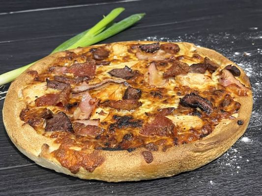 BBQ sauce, bacon, slices of freshly cooked premium rump, chicken, chorizo and pepperoni and mozzarella