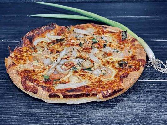 napoli sauce, calamari, seasoned prawns, seared scallops, pinch spring onion, topped w slice of lemon