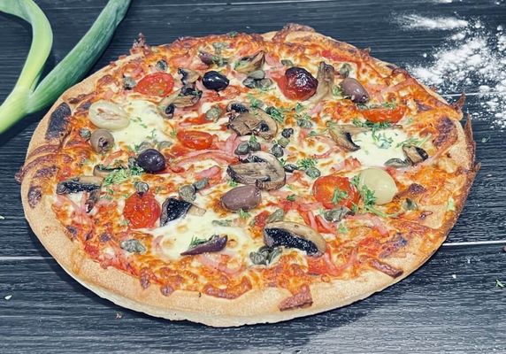napoli sauce, ham, olives, cherry tomatoes, mushrooms, bocconcini, capers