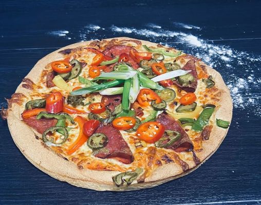 arrabbiata sauce, salami, capsicum, chilli, jalapeno, spring onion