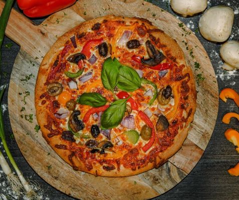 napoli sauce, capsicum, mushroom, olives, cherry tomatoes and onion